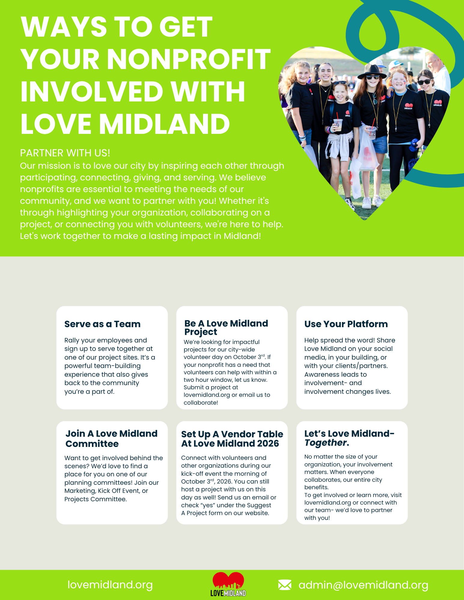 When Nonprofits and the community join forces, real change happens. Partnering with Love Midland can mean highlighting your organization on our social media, suggesting a project for our Volunteer Day, or finding other ways to collaborate.