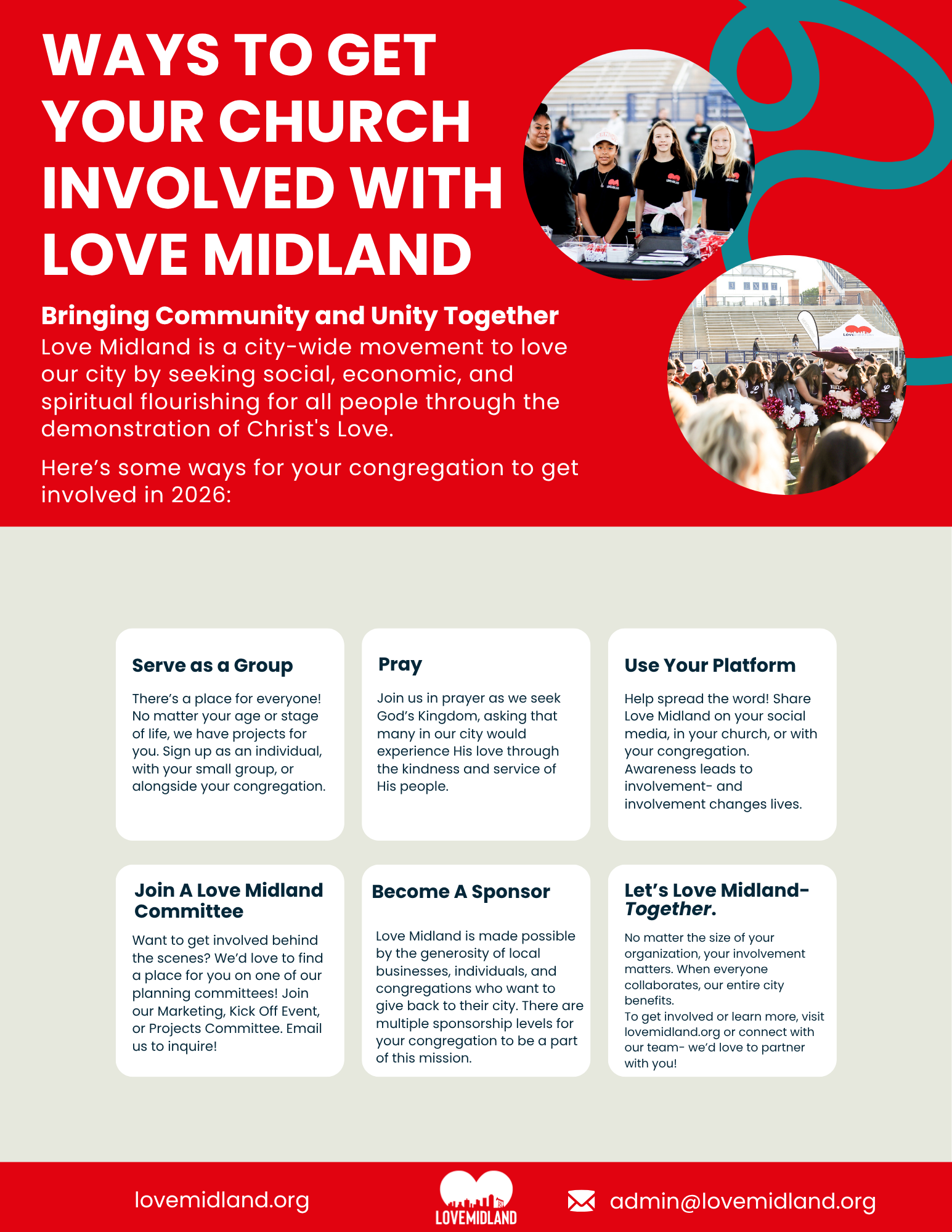 Midland is our home, and as the Church, we have the opportunity to love our city in a powerful way. Love Midland exists to bring people together- participating, connecting, giving, and serving- to make a lasting impact in our community.